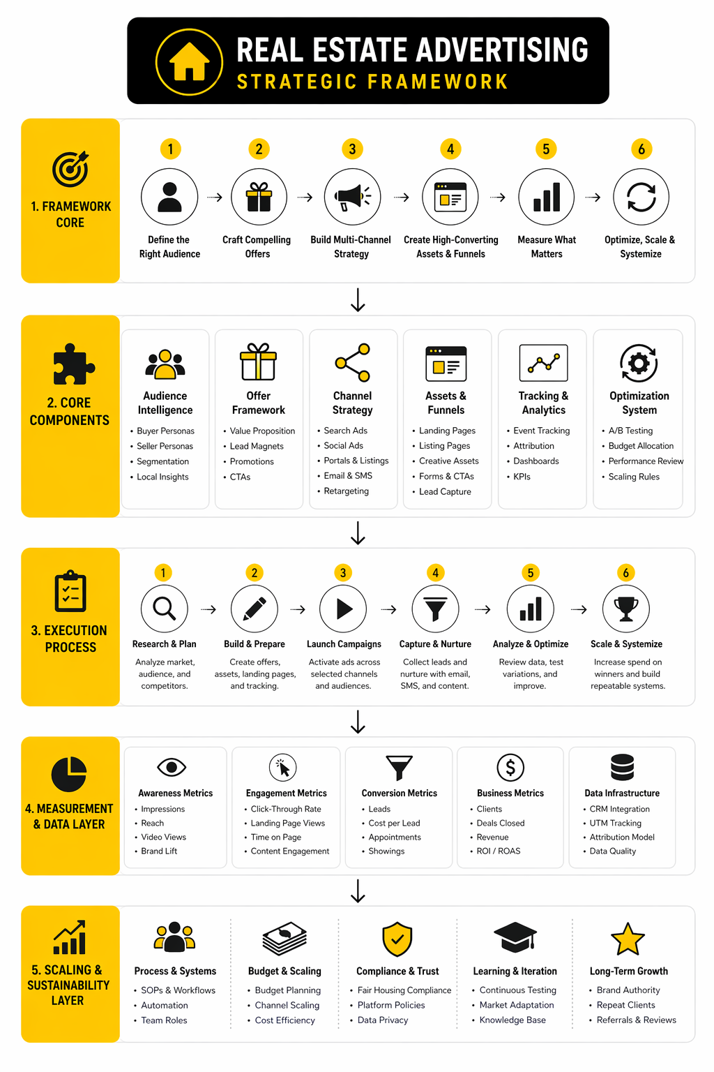 This article is structured as a practical system rather than a pile of disconnected tactics. The goal is to show how real estate advertising works from the market level down to the campaign level, so each later section builds on the one before it. These are the six sections the full article will use.
