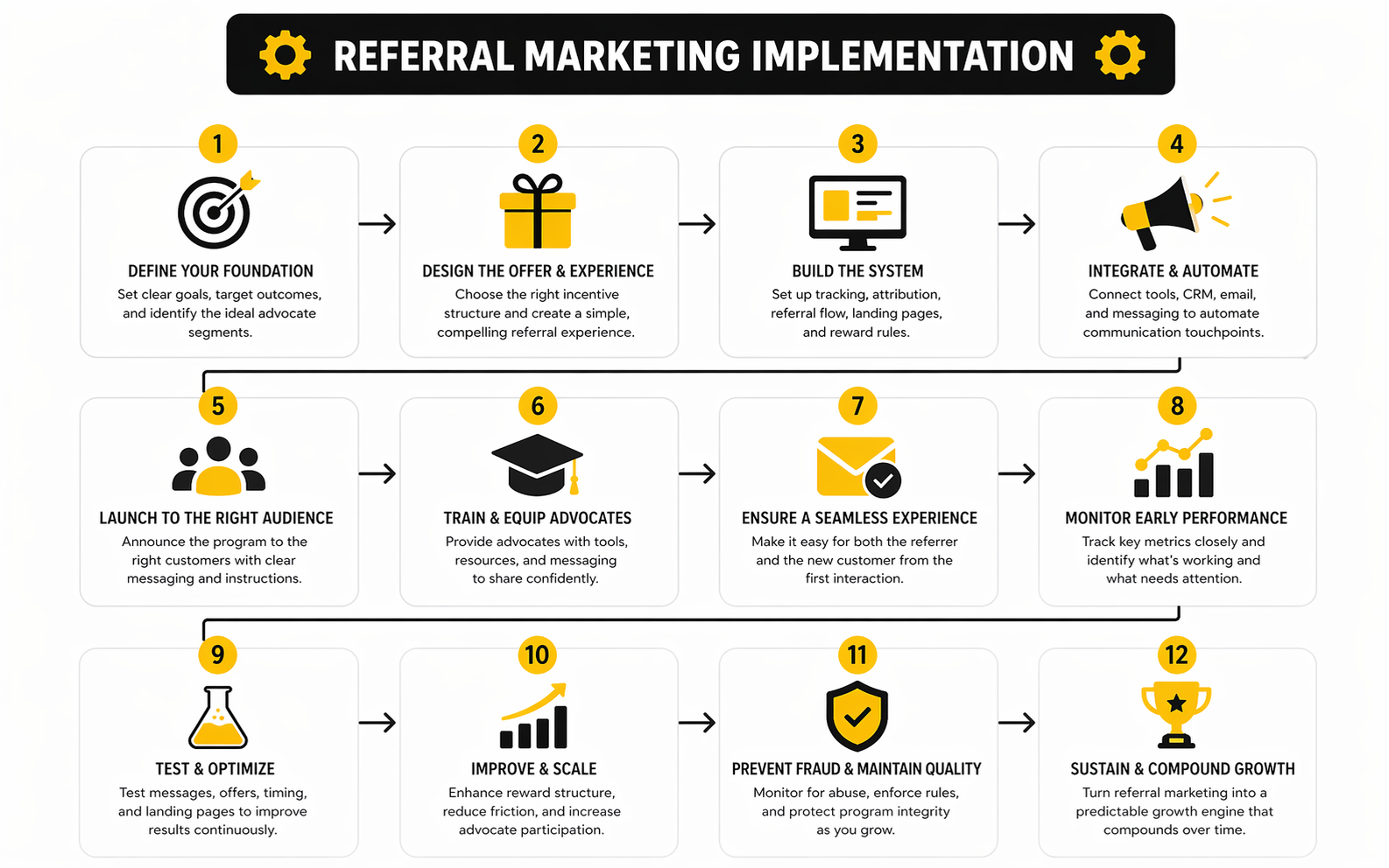 Once the strategy is clear, referral marketing becomes an execution problem. That is actually good news, because execution is fixable. You do not need a clever slogan or some mythical viral hook. You need a process that makes the ask timely, the share easy, the destination credible, and the reward automatic.