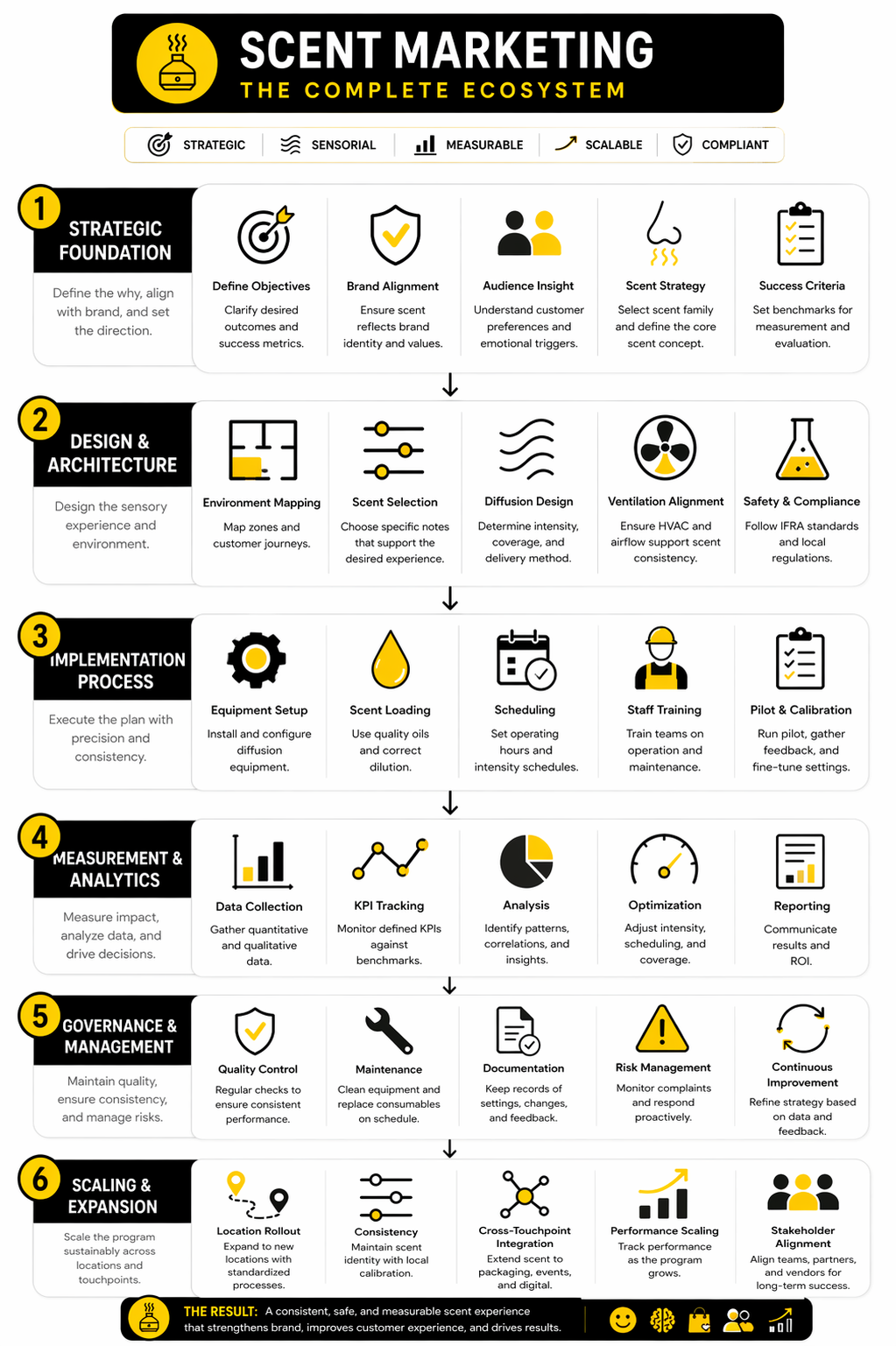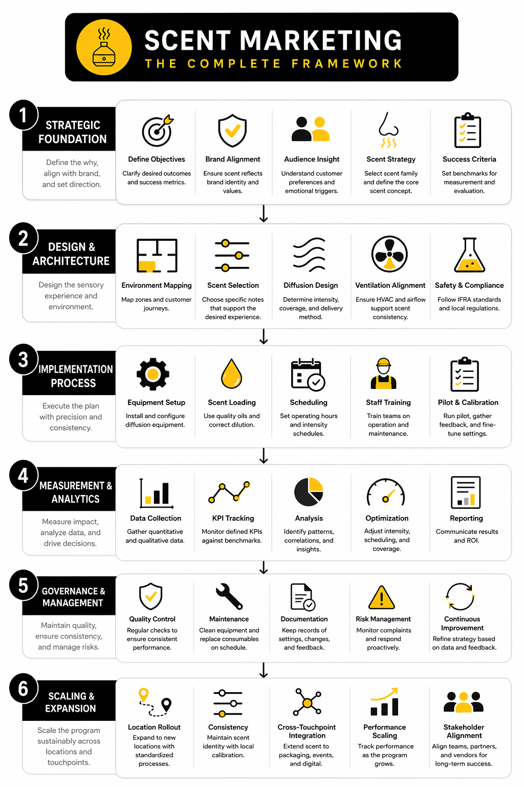 At this point, the shape of a serious scent marketing program should be clear. It starts with brand fit, moves through environmental calibration and controlled implementation, and only becomes truly valuable when measurement, governance, and scaling discipline are in place. That is the difference between a space that simply smells pleasant and a space that uses scent as a durable brand asset.