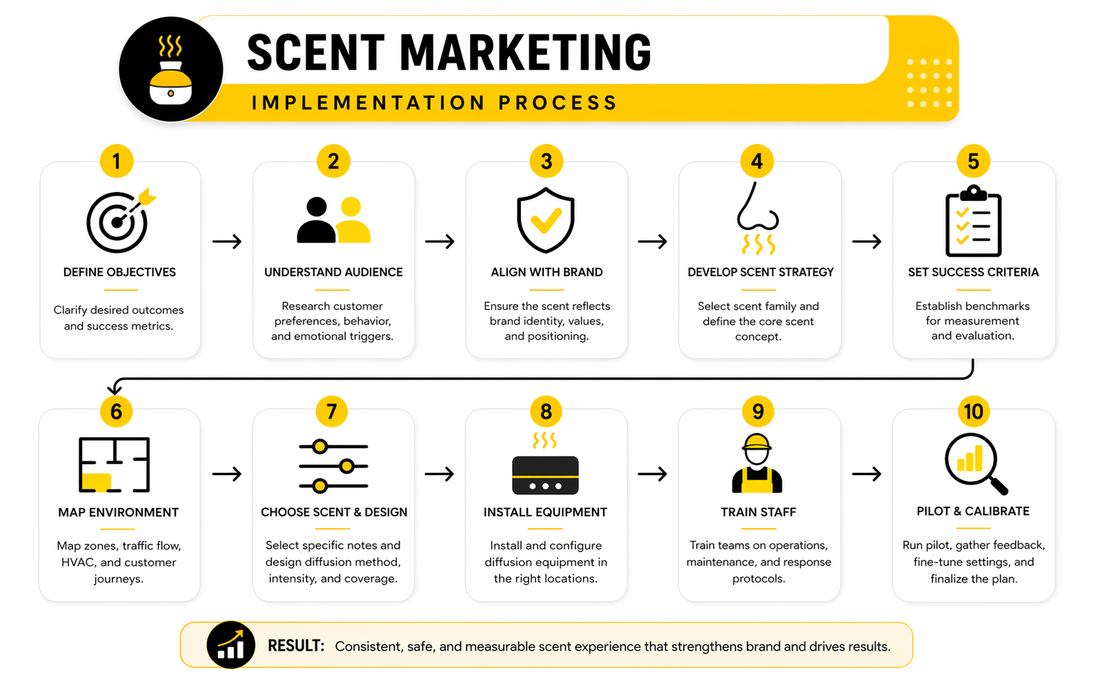 In practice, the cleanest way to implement scent marketing is to move through a disciplined sequence instead of improvising. The brands that get the best long-term results usually follow a pattern like this: