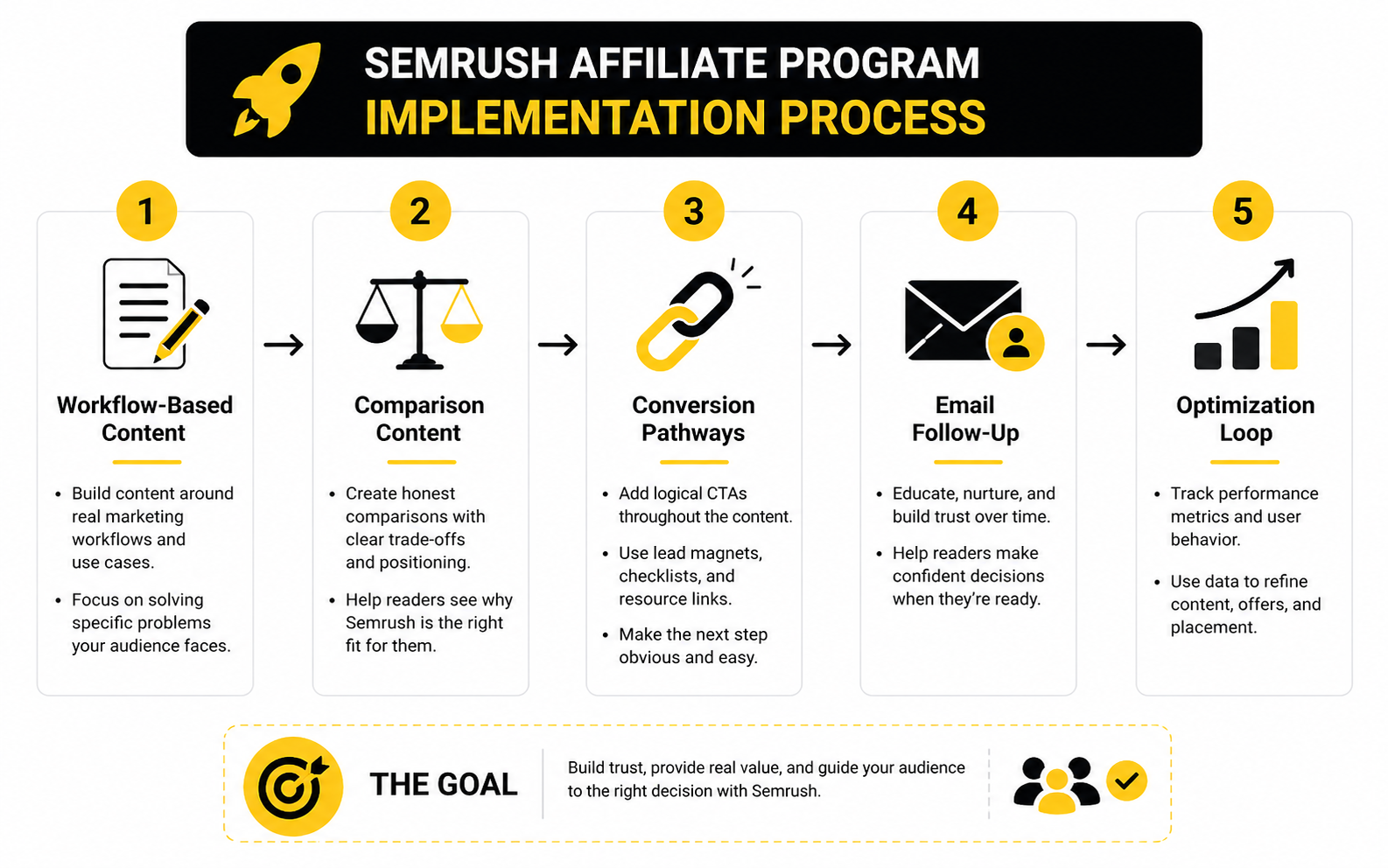 Once the positioning is clear, the next step is execution. This is where most affiliates either build an asset that compounds or create a pile of disconnected posts that never turn into a real business. The Semrush affiliate program works best when your content, capture points, and follow-up flow all support the same buyer journey.