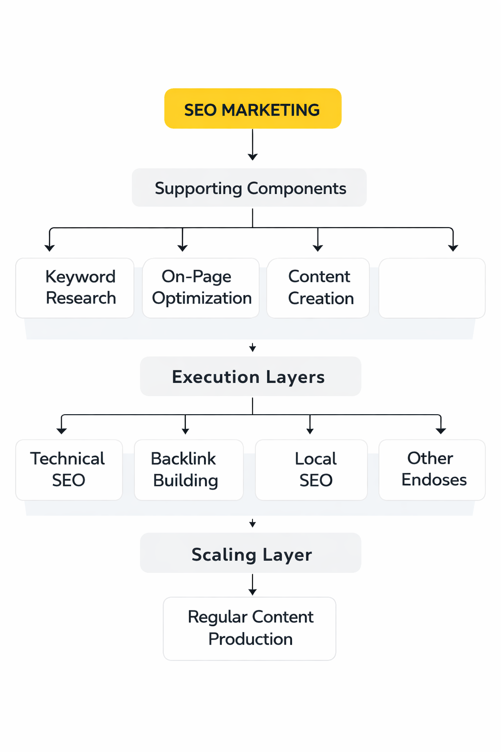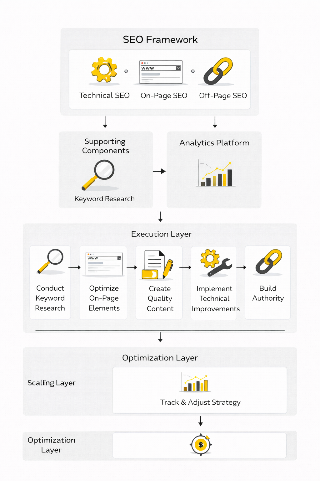Once you accept that SEO marketing is not a trick but a system, the next question becomes obvious: what does that system actually look like? The cleanest way to think about it is as a framework with four connected layers. Miss one of them, and the rest underperform.