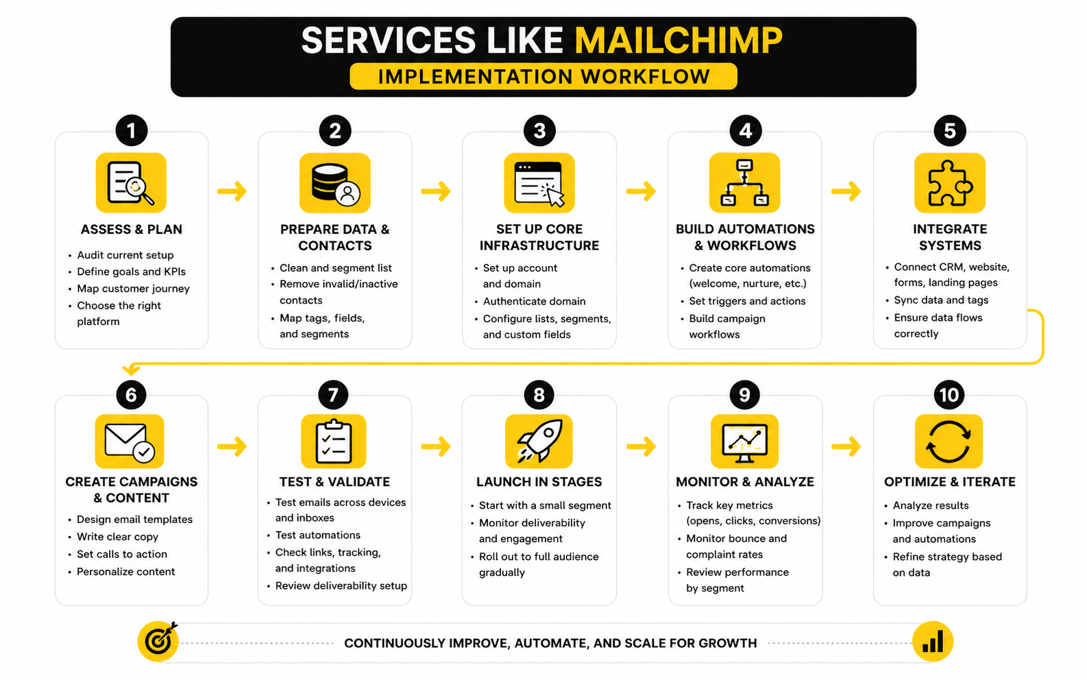 - Test every workflow manually using real signup paths and test contacts.