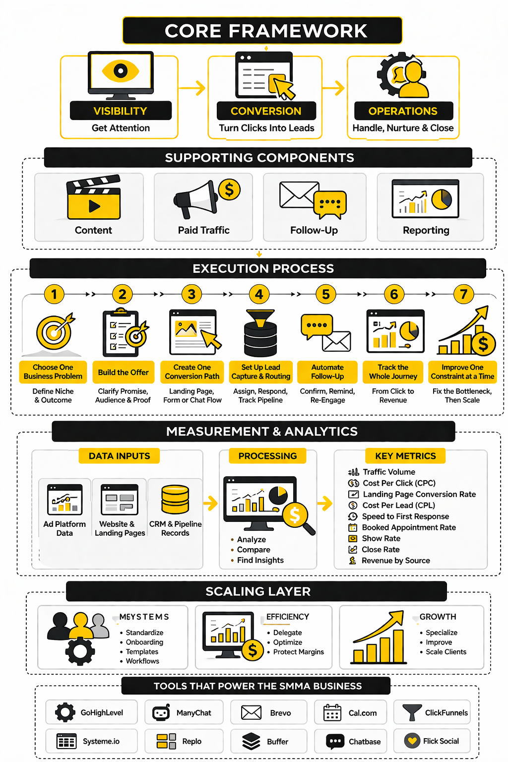 The easiest way to understand an SMMA business is to stop thinking about it as a “social media agency” in the narrow sense. In practice, the strongest agencies are client acquisition operators. They may use social platforms, search ads, landing pages, email, SMS, content, or outbound, but the commercial goal is the same: create a reliable flow of demand and make that demand measurable.