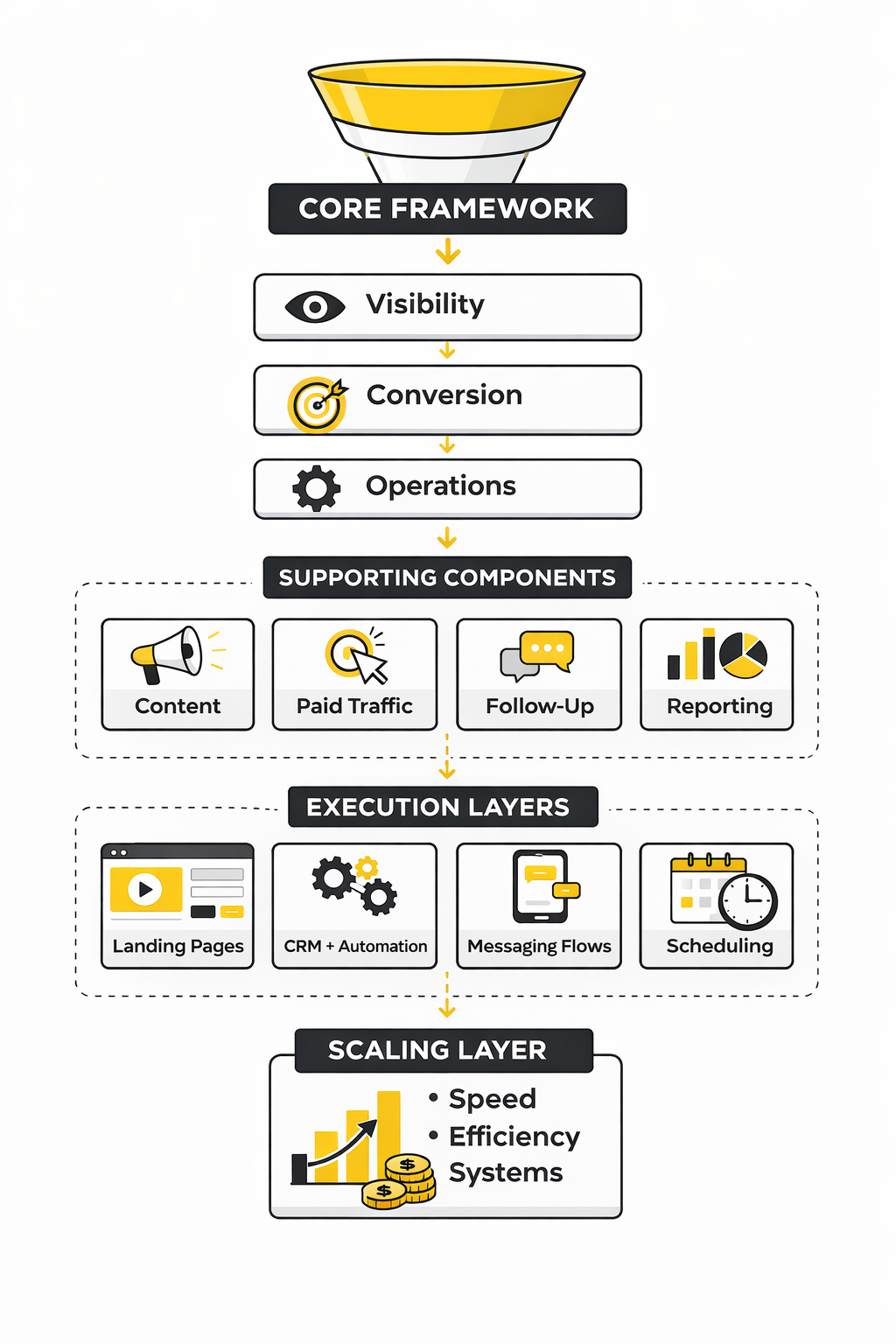A modern delivery stack often reflects that shift. Tools like GoHighLevel, ManyChat, Buffer, and Chatbase fit when they support a clear client outcome, not when they are used as shiny objects. The real framework is offer, channel, conversion path, follow-up, reporting, and retention.