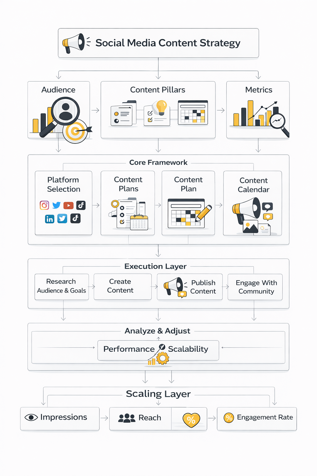 The sequence matters. Before you touch a content calendar, you need a framework. Before you choose formats, you need positioning. Before you buy more software, you need a publishing system that can survive real life, whether you run it with Buffer for scheduling, Manychat for DM automation, or HighLevel when your social media content strategy also needs to feed leads into a real pipeline. The next part starts with the framework itself, because that is where strategy stops sounding smart and starts becoming usable.