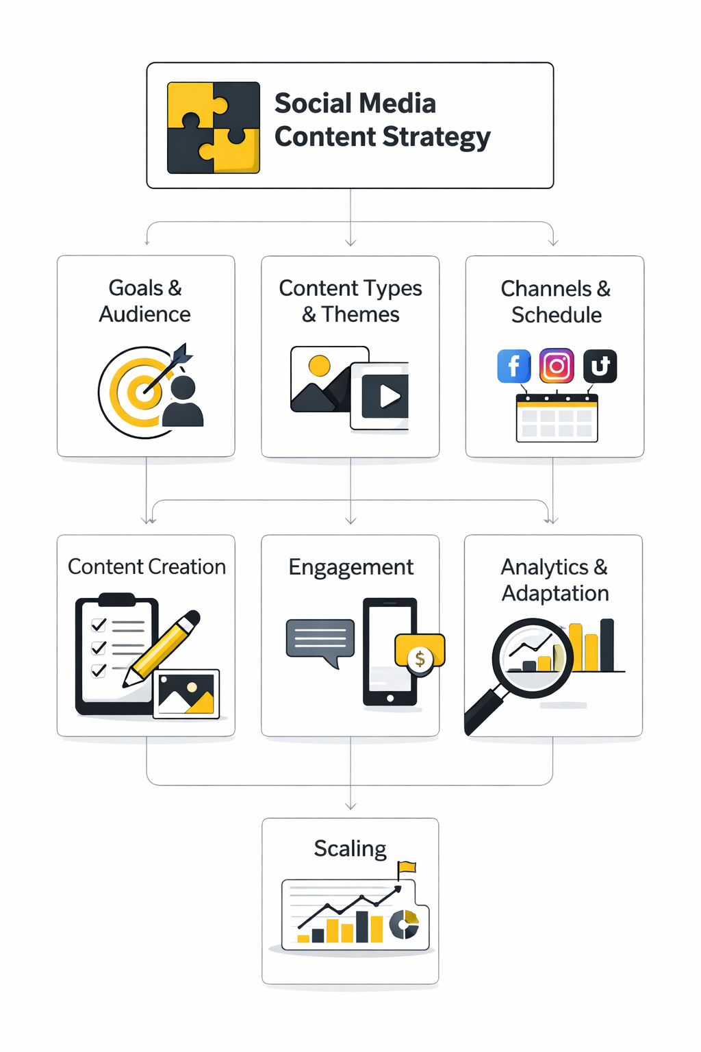 This article is built as one continuous six-part guide, and the section names below are the exact sections the rest of the article will follow. I am not going to pretend social media content strategy is one template you can copy from a generic blog post, because it changes with audience behavior, business model, and platform mechanics. What does stay stable is the operating logic: know who you want to influence, define what you want to be known for, turn that into repeatable content pillars, and run the whole thing with a workflow your team can actually sustain.