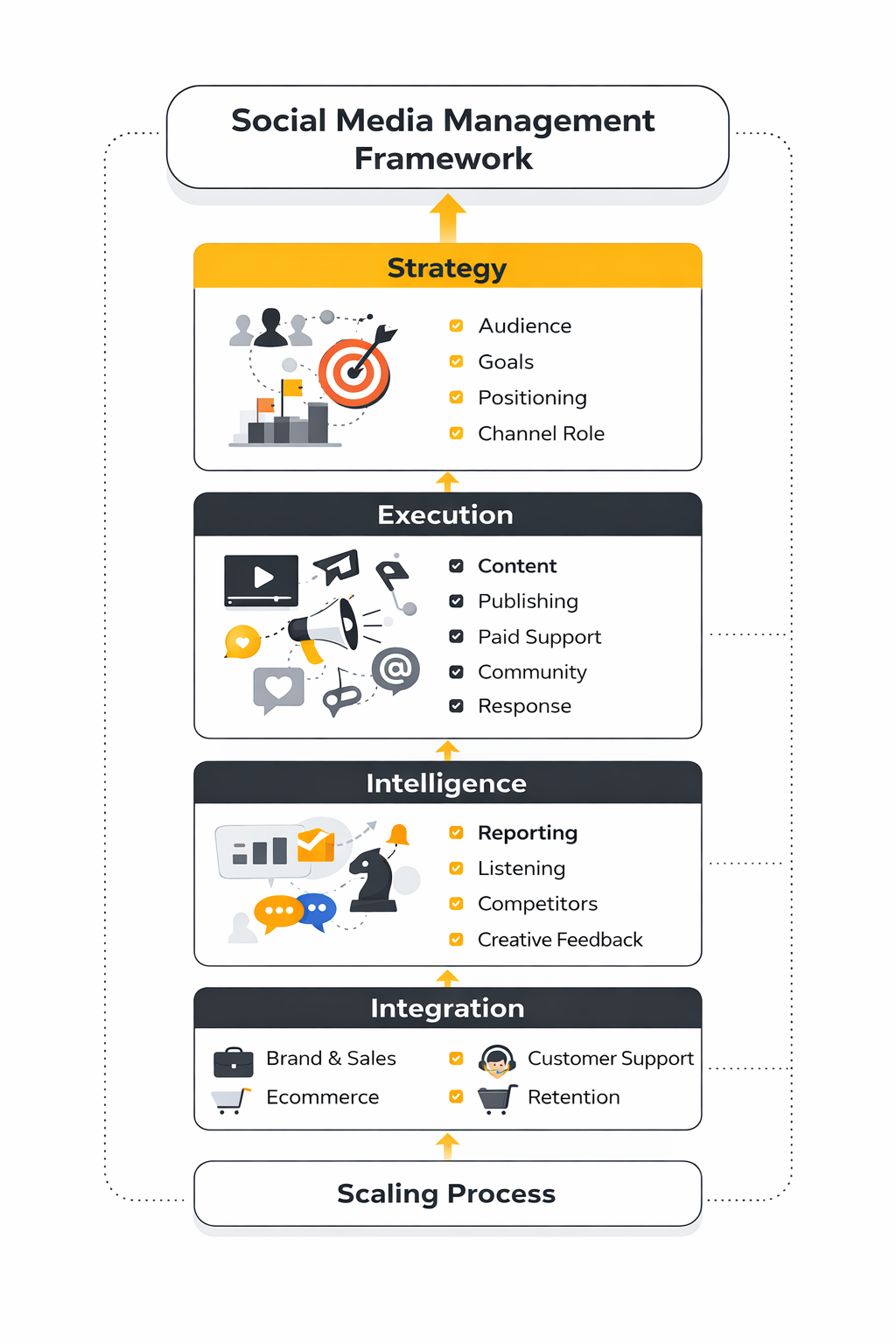 A practical way to think about this is through four layers. Strategy defines audience, goals, positioning, and channel role. Execution covers content production, publishing, paid support, community management, and response workflows. Intelligence includes reporting, social listening, competitor monitoring, and creative feedback loops. Integration connects social to the rest of the business, including brand, sales, customer support, ecommerce, and retention. When a partner is weak in any one of those layers, performance usually stalls no matter how good the content looks.