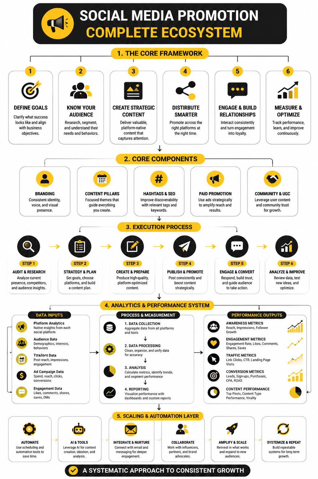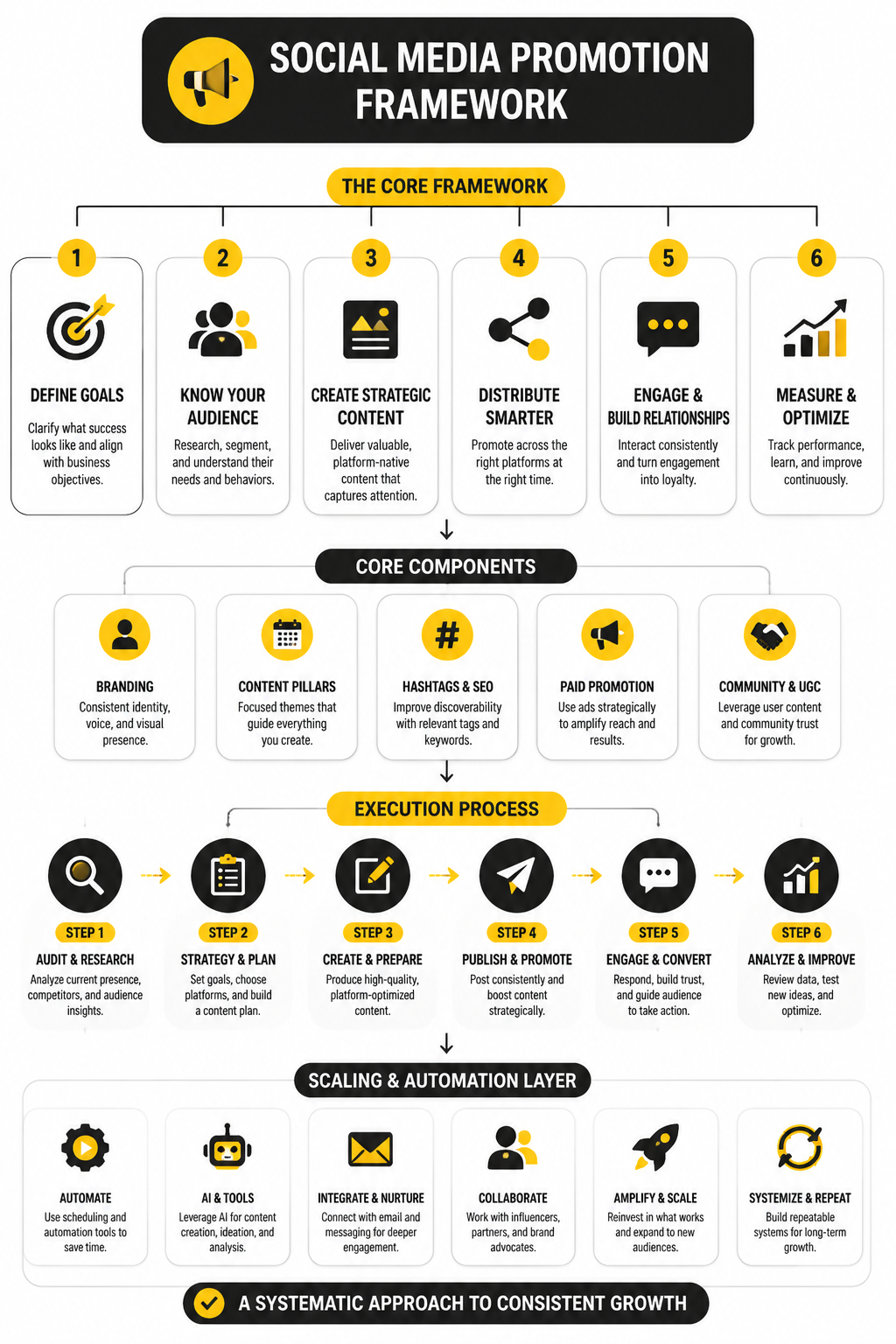 This article will break down each part of the framework in detail, providing actionable insights for businesses seeking to build a repeatable, measurable, and scalable social media promotion system.