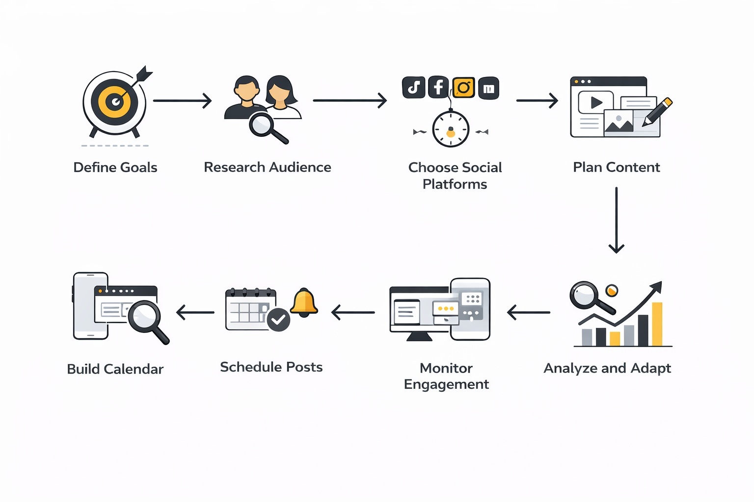 The framework in this article is built around a practical flow. First, define the business objective and the role social should play. Next, match that role to the right audience segments, the right channels, and the right content approach. Then build the operating layer: publishing cadence, creative workflow, community management, reporting, and optimization.