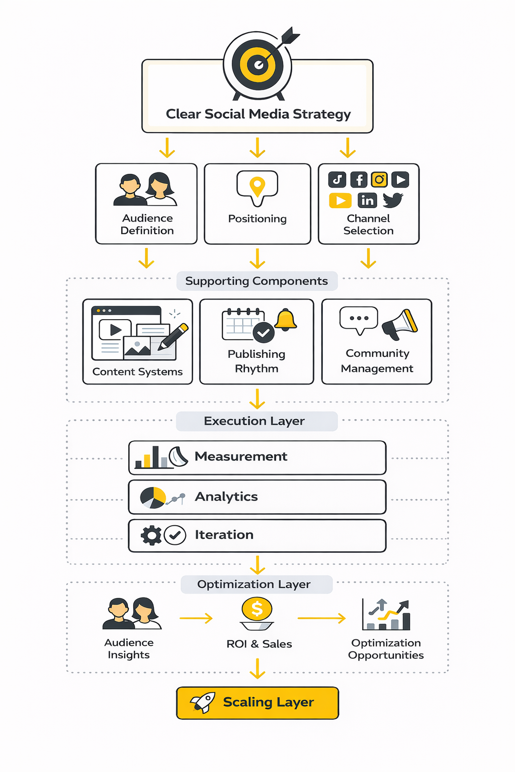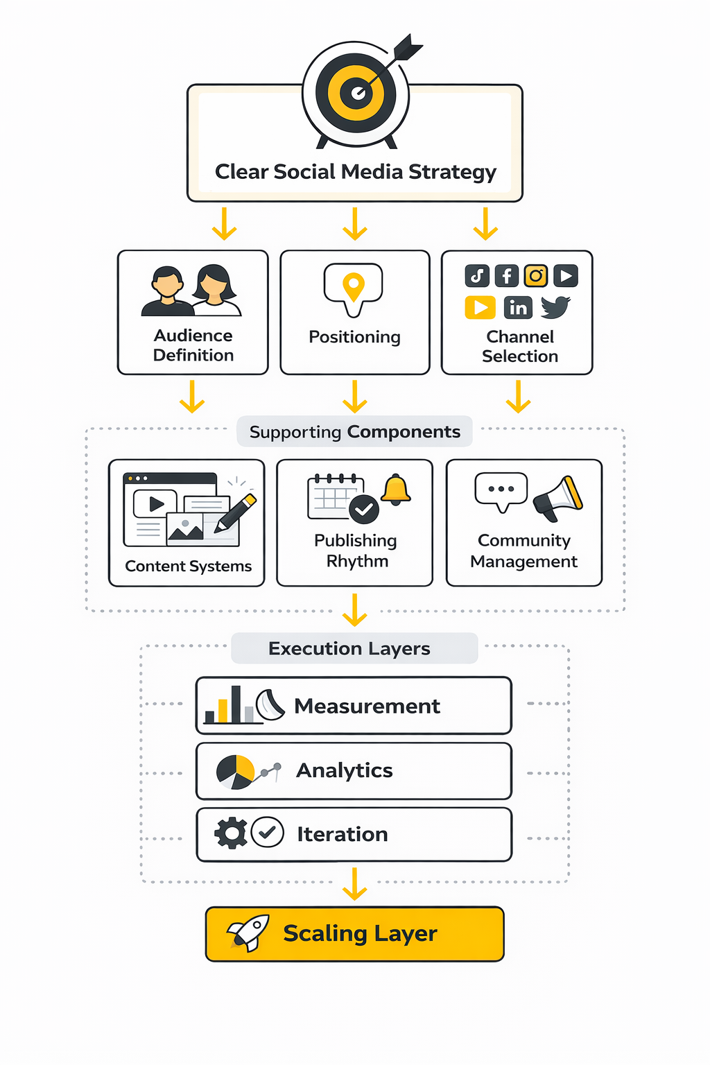 A social media strategy is a clear plan for how a brand will use social platforms to support business goals. It covers audience definition, positioning, channel selection, content systems, publishing rhythm, community management, measurement, and long-term scaling. In other words, it is not just a content calendar. It is the logic behind the calendar.