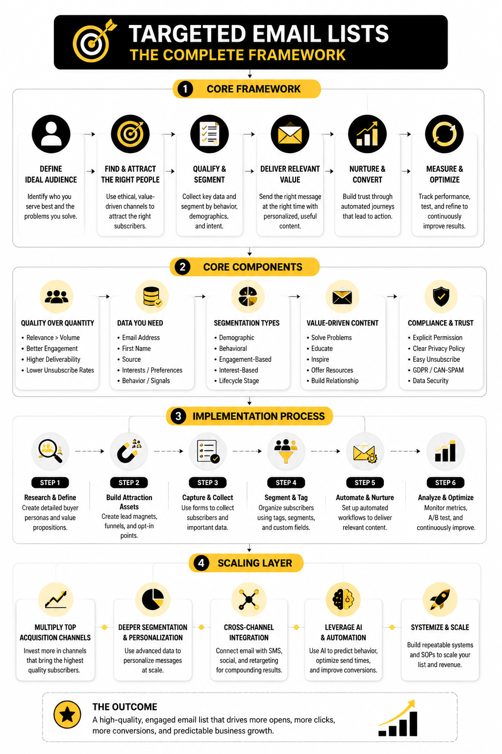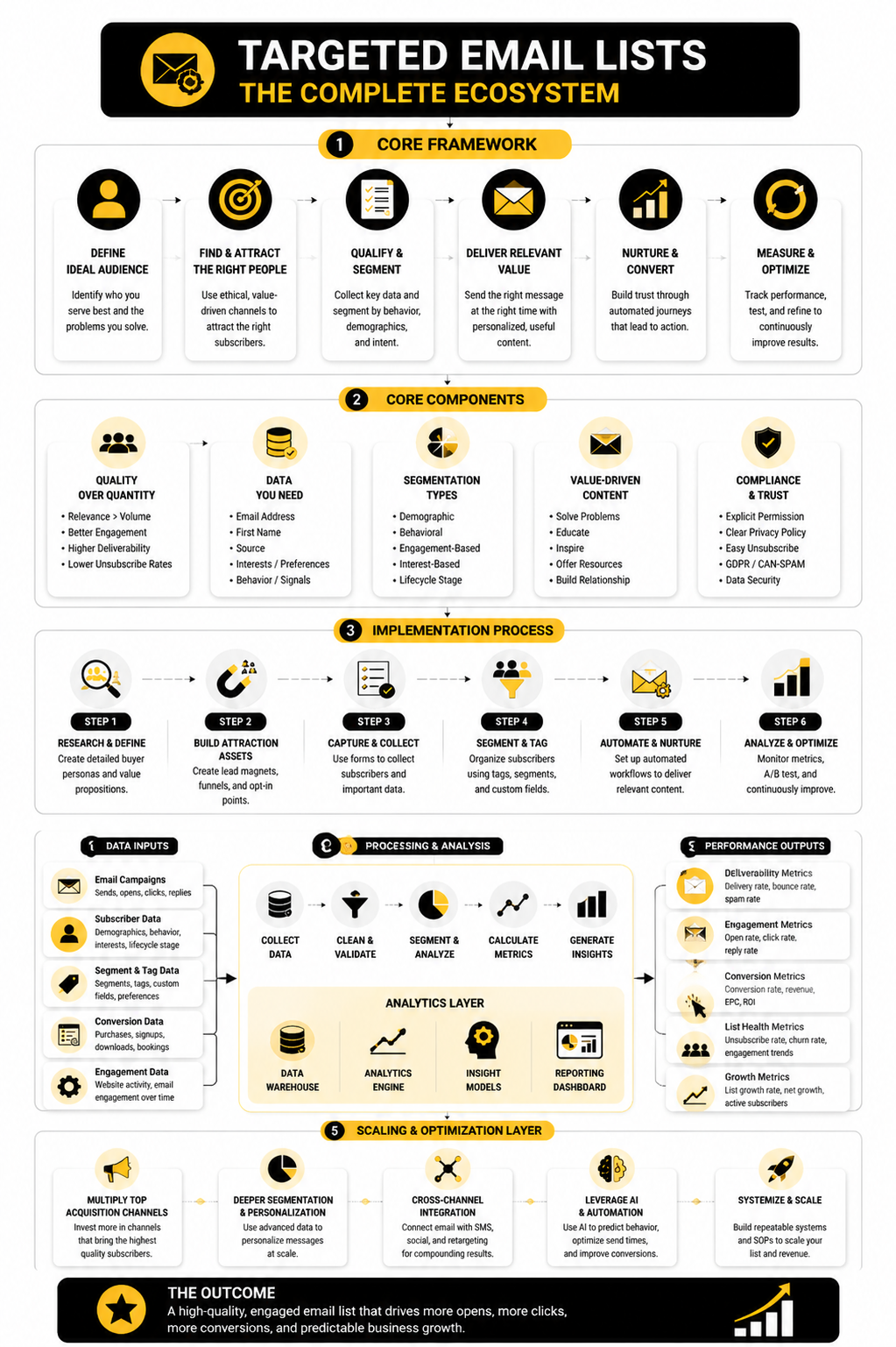 Creating a reliable targeted email list requires a clear system. A strong framework guides how you capture, verify, segment, and maintain your contacts for maximum efficiency. The framework typically includes: