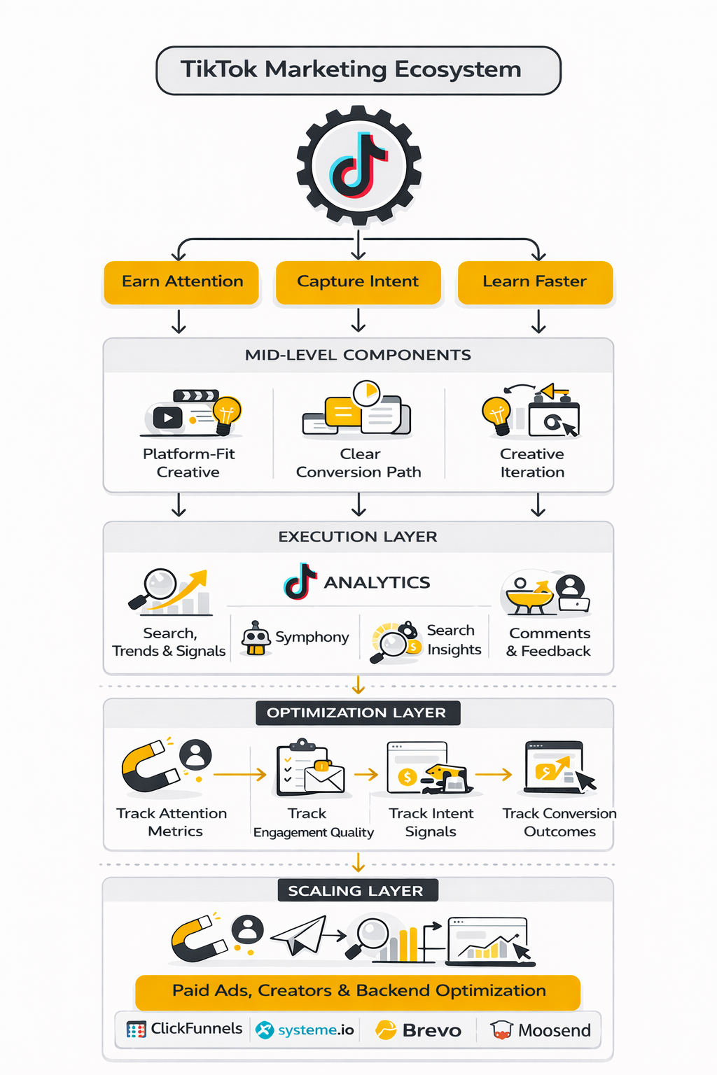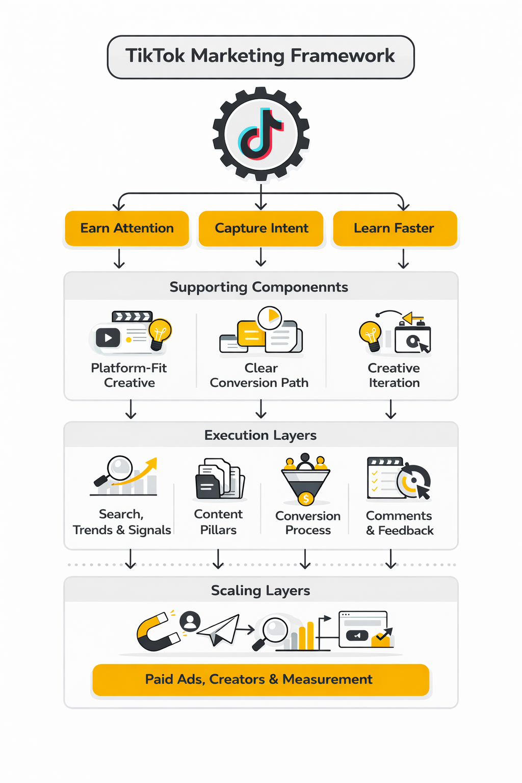 The framework for strong TikTok execution is simpler than most people make it. You need content that earns attention, a clear path that captures intent, and a feedback loop that helps you learn faster than competitors. Everything else is detail.