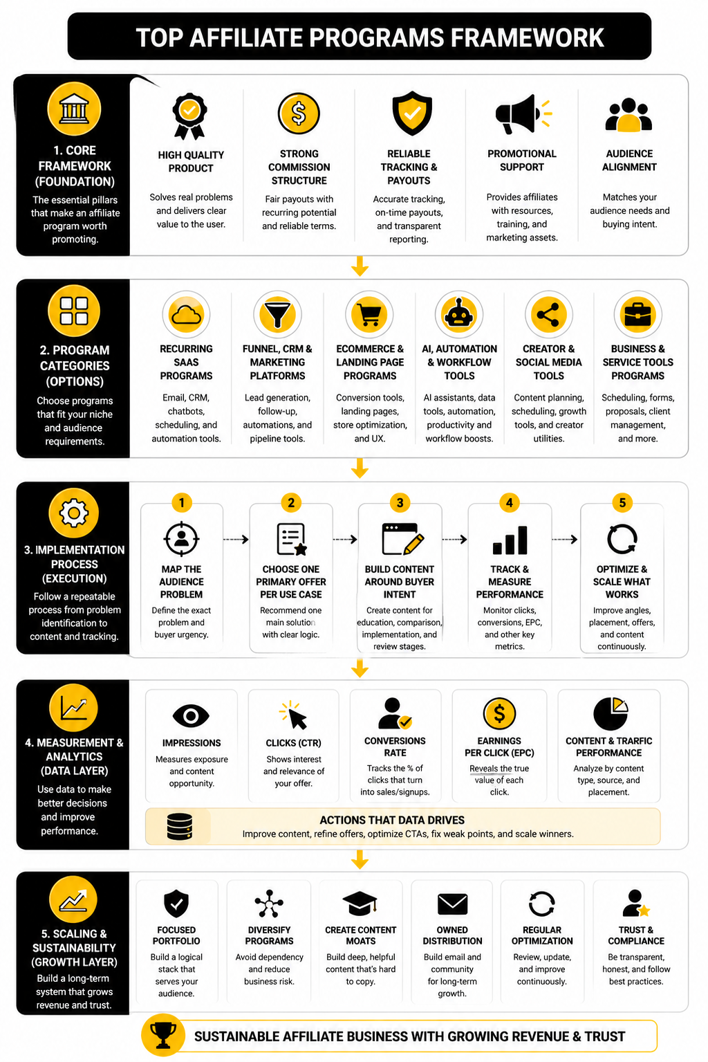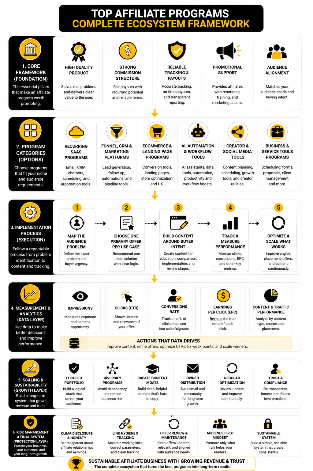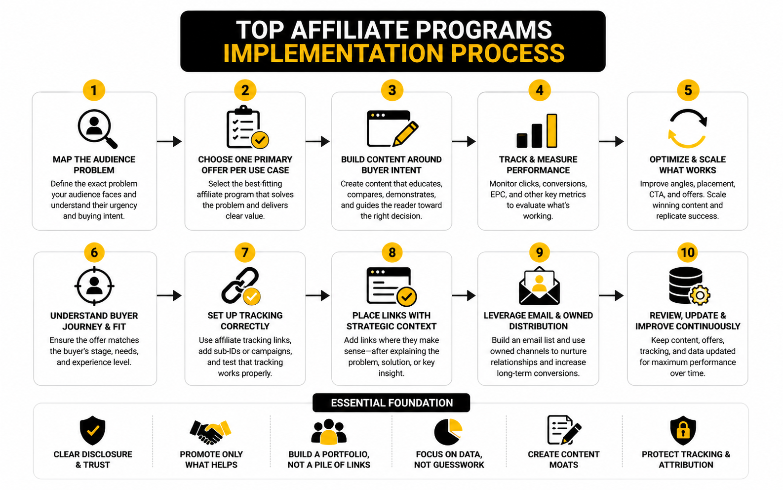 The real advantage comes from treating top affiliate programs like business assets. You need a clear content map, clean tracking, strong disclosures, offer backups, and a review rhythm. That may sound less exciting than chasing the newest commission, but it is what separates durable affiliate income from random spikes.