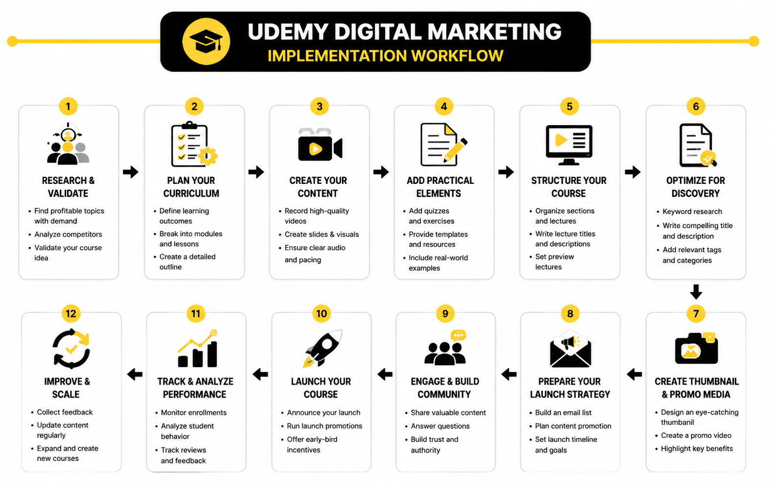 Taking courses on Udemy digital marketing is only the start — the real value comes when you turn that knowledge into action. Implementation is where your skills translate into measurable outcomes, whether you’re growing an audience, driving leads, or optimizing campaigns for a business or client. This section breaks down the execution process so you can follow a logical sequence from planning to performance.