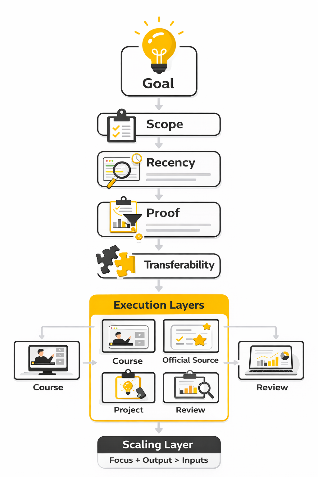 Transferability is the final filter, and it is the one people skip. Ask whether the course teaches platform-specific button clicks only, or whether it teaches ideas you can carry into real work: audience research, funnel logic, creative testing, offer positioning, measurement, and iteration. Those principles survive tool changes. That is why this framework works: it keeps you from buying a course just because it looks comprehensive, and pushes you toward training that stays useful after the interface changes.