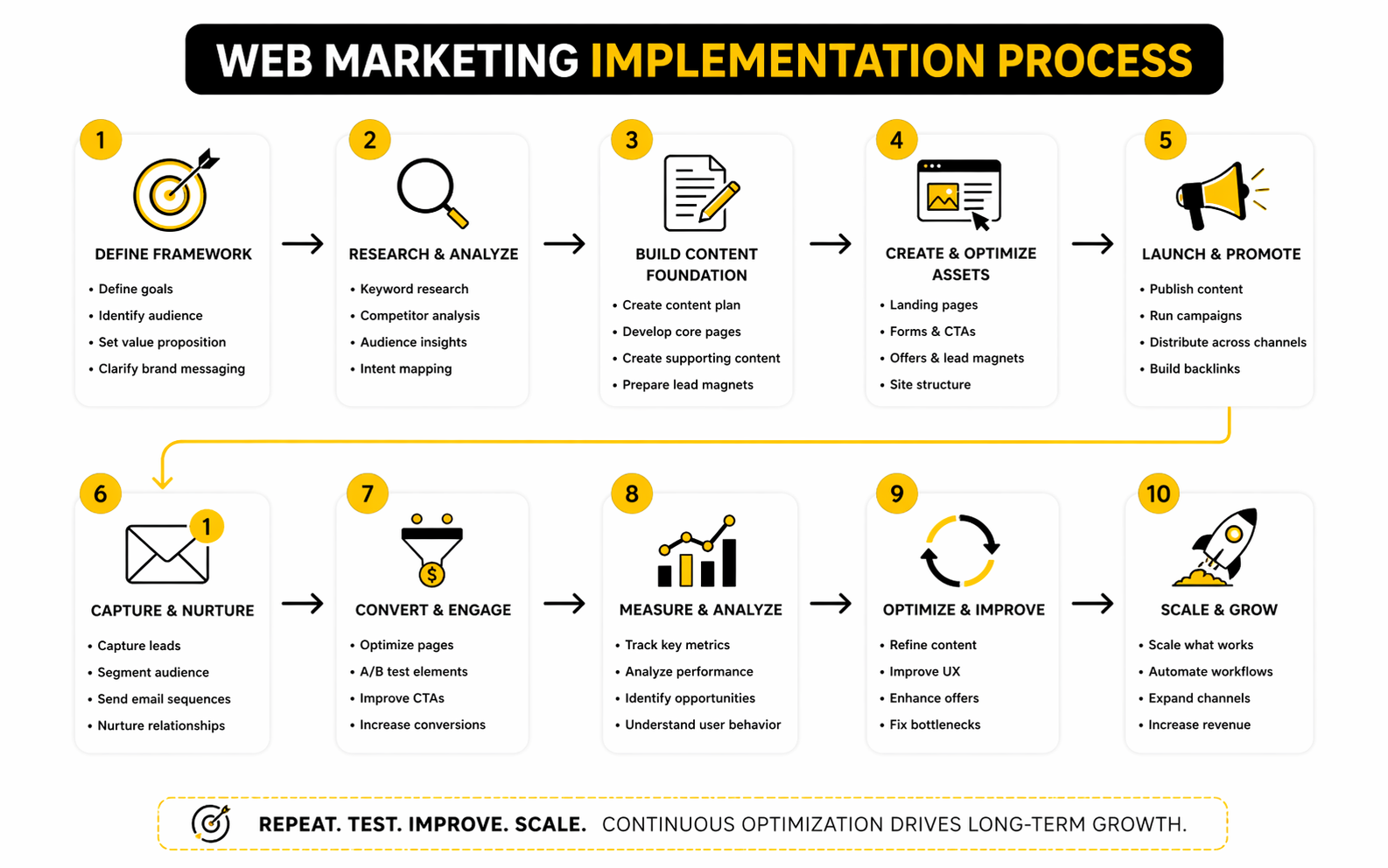 The order matters. We will start with the strategic foundation, move into the channels and assets that create demand, then finish with conversion, retention, and implementation. That sequence reflects how strong web marketing actually works in practice.
