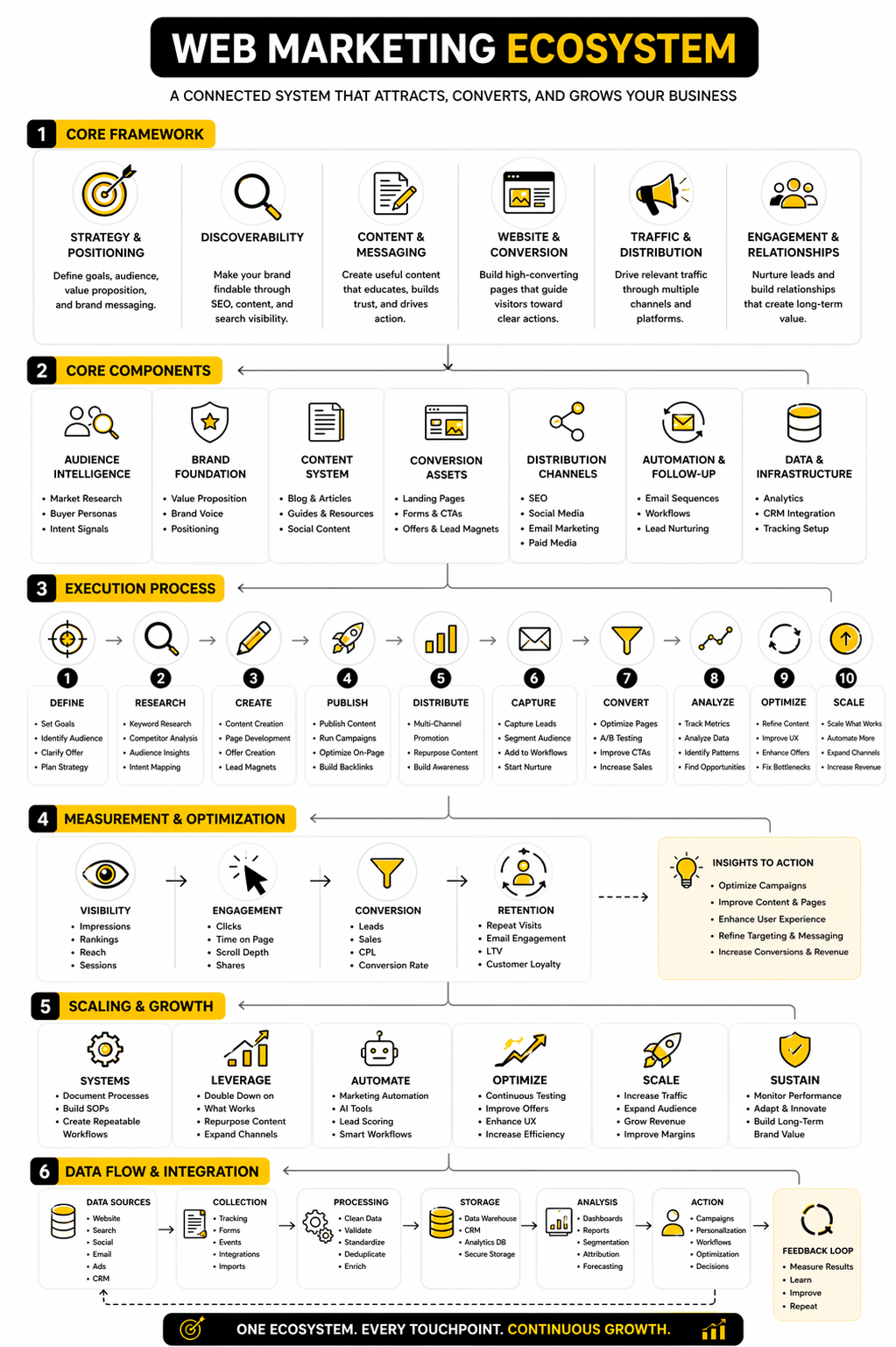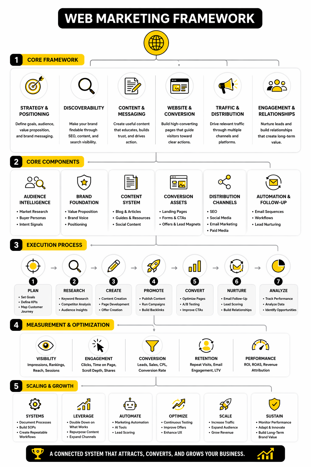 This article is structured as one connected guide split across six parts. Each section builds on the one before it, so the logic stays consistent from strategy to execution. By the end, you should be able to look at your current web marketing setup and quickly identify what to fix, what to scale, and what to stop doing.