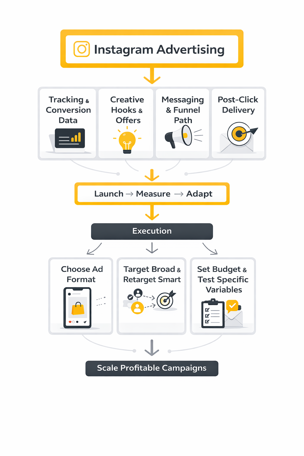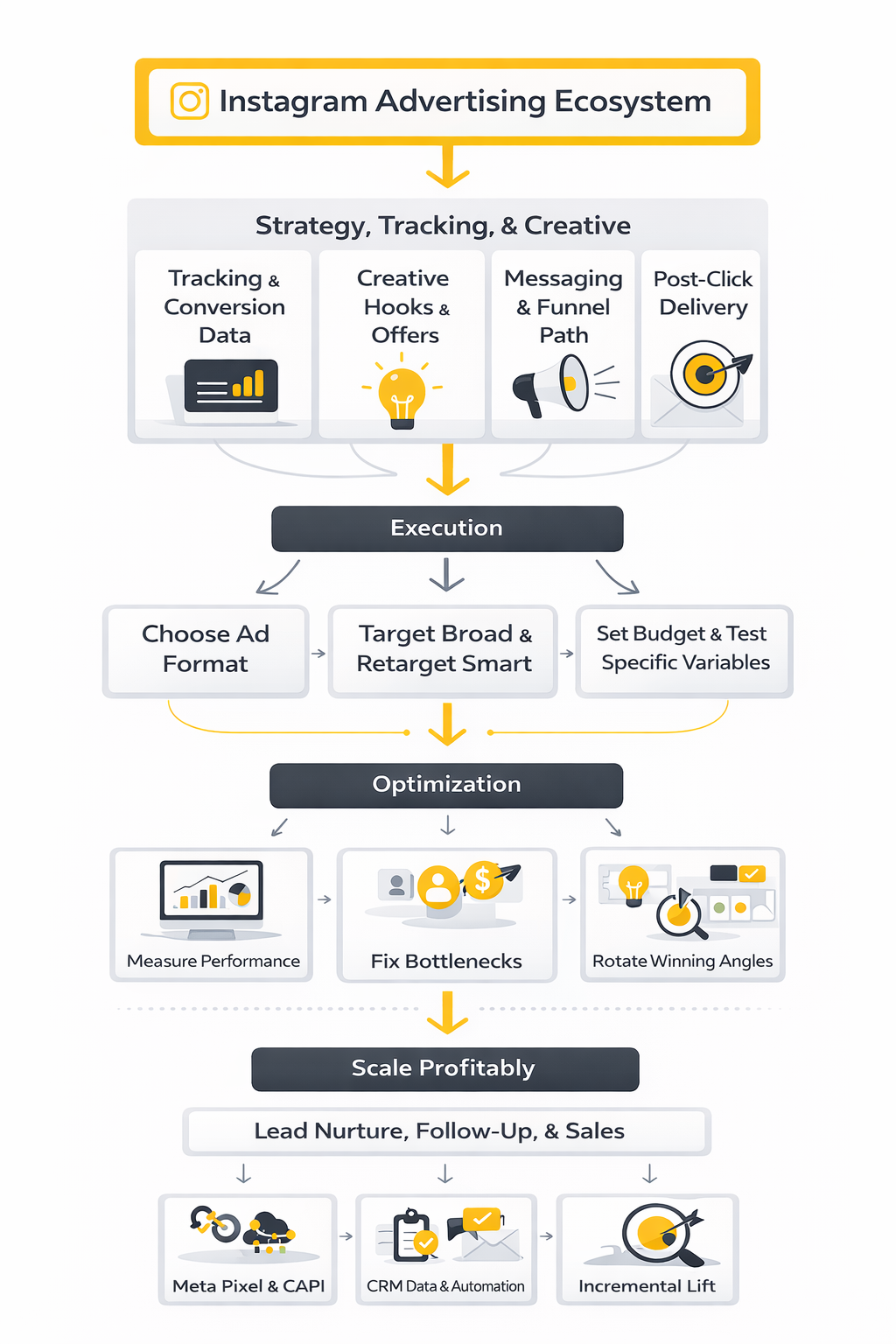 The beginner view of instagram advertising is ad-centric. The advanced view is system-centric. The ad matters, but so do the landing page, the form logic, the CRM, the nurture flow, the appointment booking, the sales process, the retention engine, and the quality of the data feeding back into the platform.